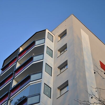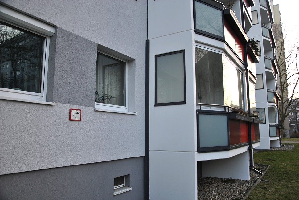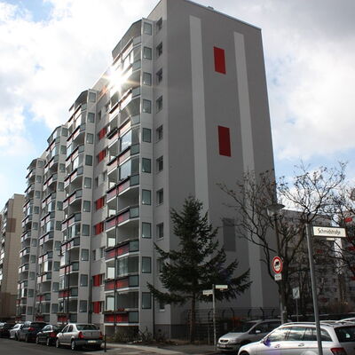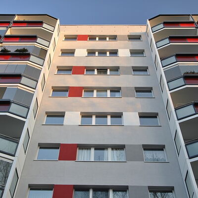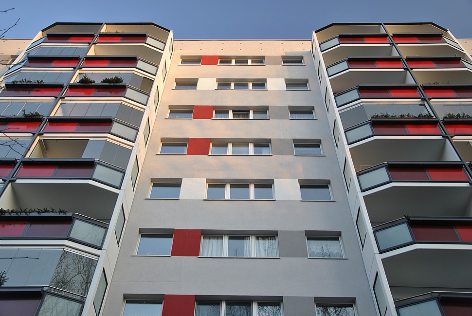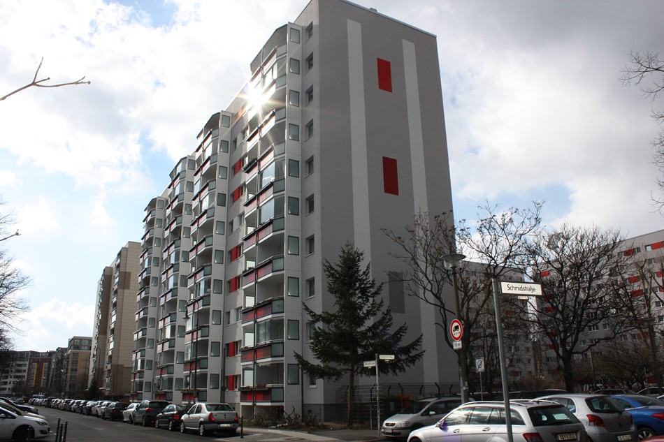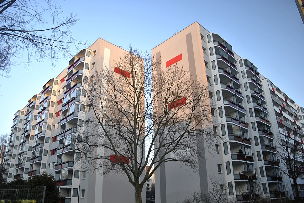 Fassadenanstricharbeiten an 11-geschossigen Wohnbauten Typ PII 12.000qm Anstrich auf WDVS, 2.100qm WDVS auf Giebelflächen 3.000qm Anstrich auf Betonflächen der Balkone, inkl. Gerüststellung und Demontage VHF-Fassadean den Giebelflächen