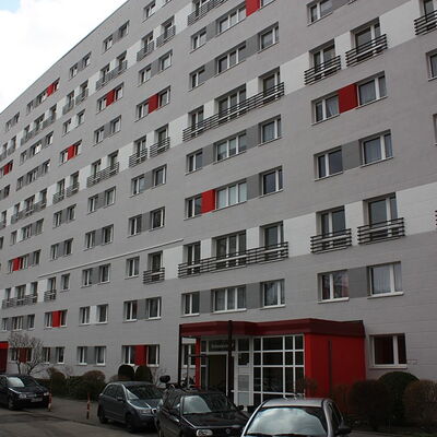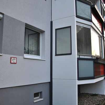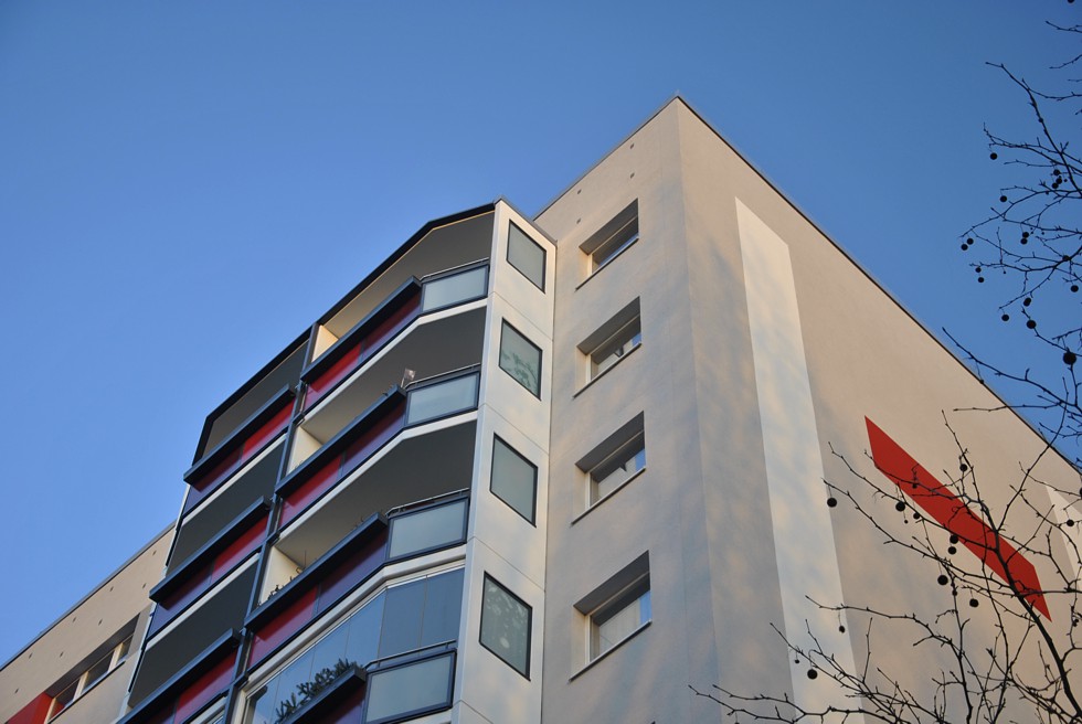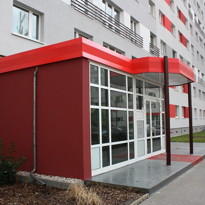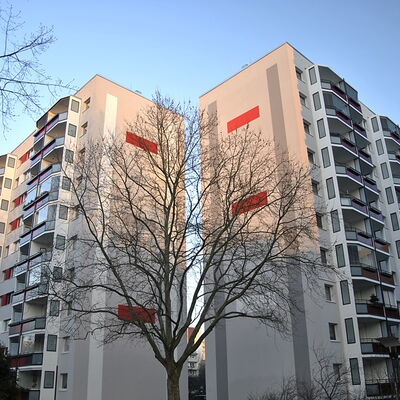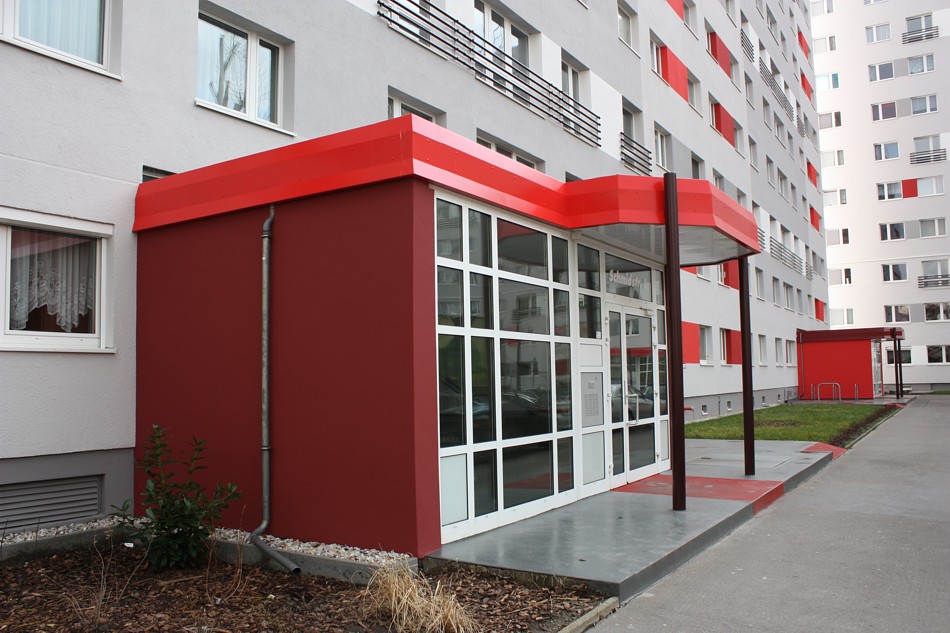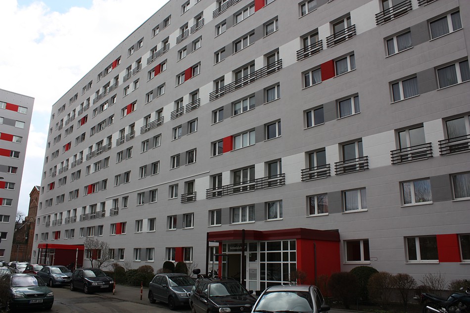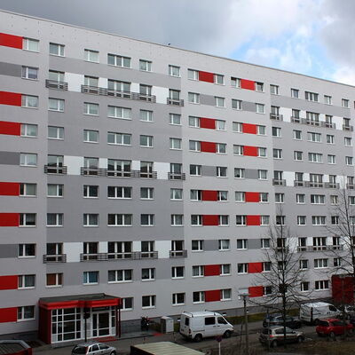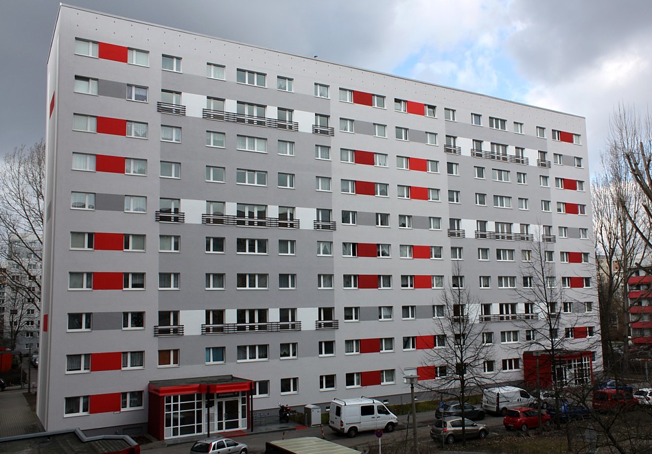 Fassadenanstricharbeiten an 11-geschossigen Wohnbauten Typ PII 12.000qm Anstrich auf WDVS, 2.100qm WDVS auf Giebelflächen 3.000qm Anstrich auf Betonflächen der Balkone, inkl. Gerüststellung und Demontage VHF-Fassadean den Giebelflächen